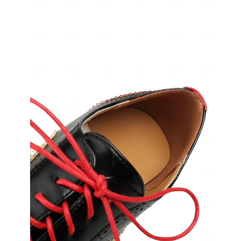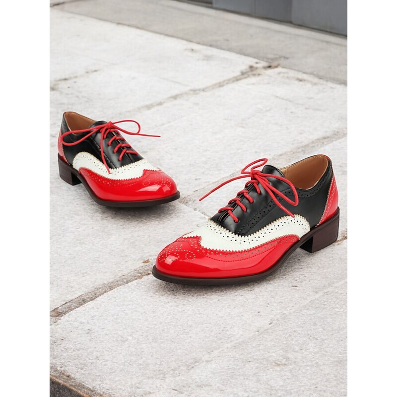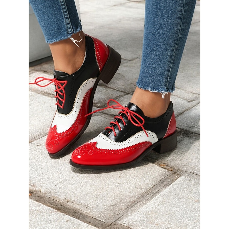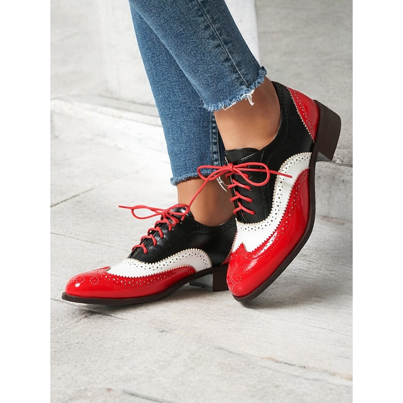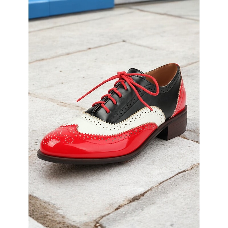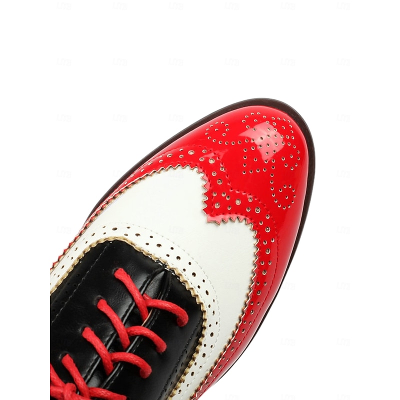 Women's Red and Black Patent Leather Oxford Shoes with Brogue Detailing – Vintage-Style Lace-Up Formal Shoes for Business and Casual Wear