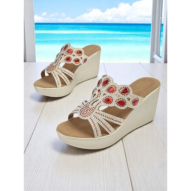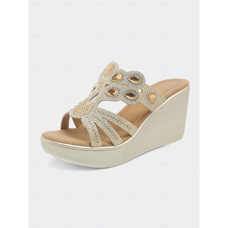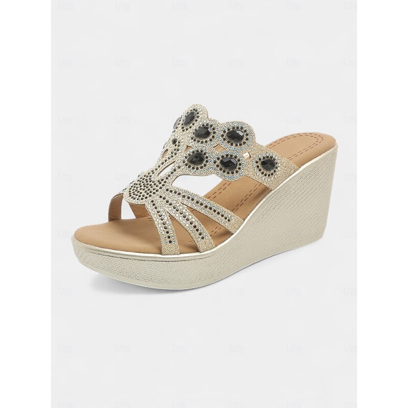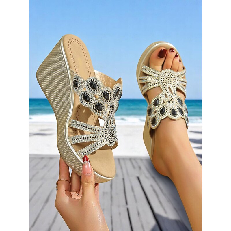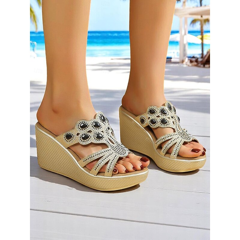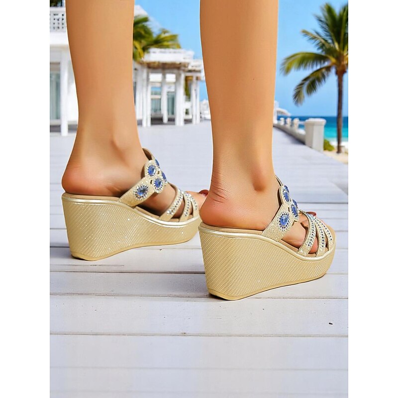 popular ! Women's Boho Gold Rhinestone Wedge Sandals – Sparkly Slip-On Platform Heels for Beach Vacations, Summer Parties, and Resort Wear