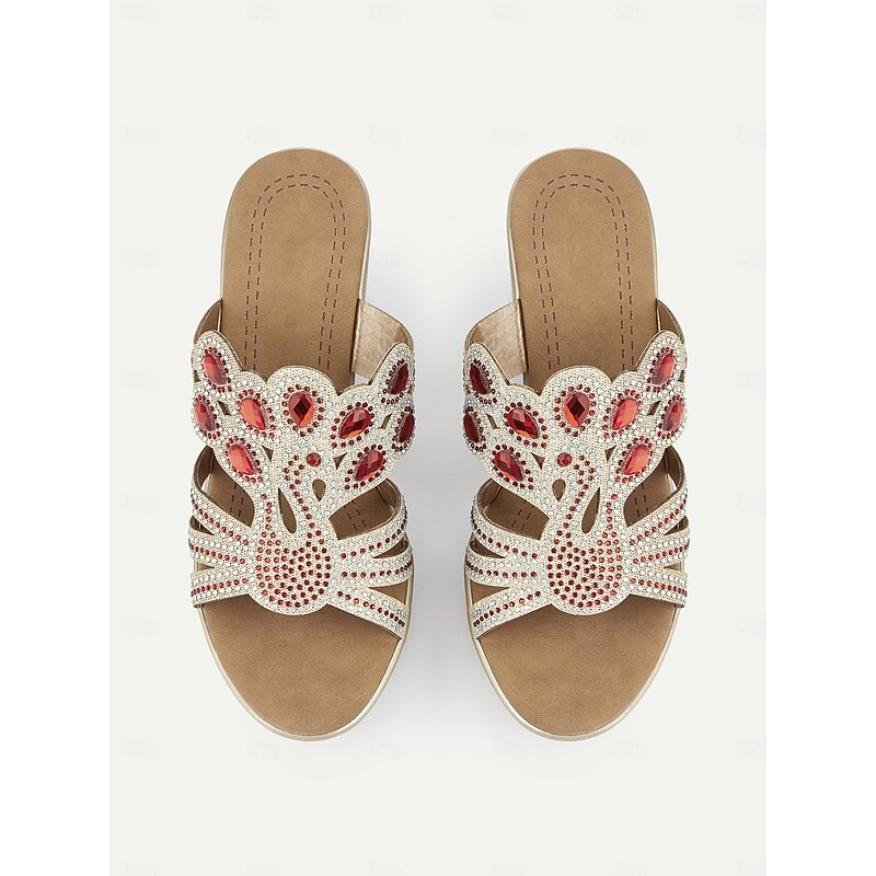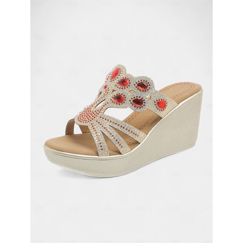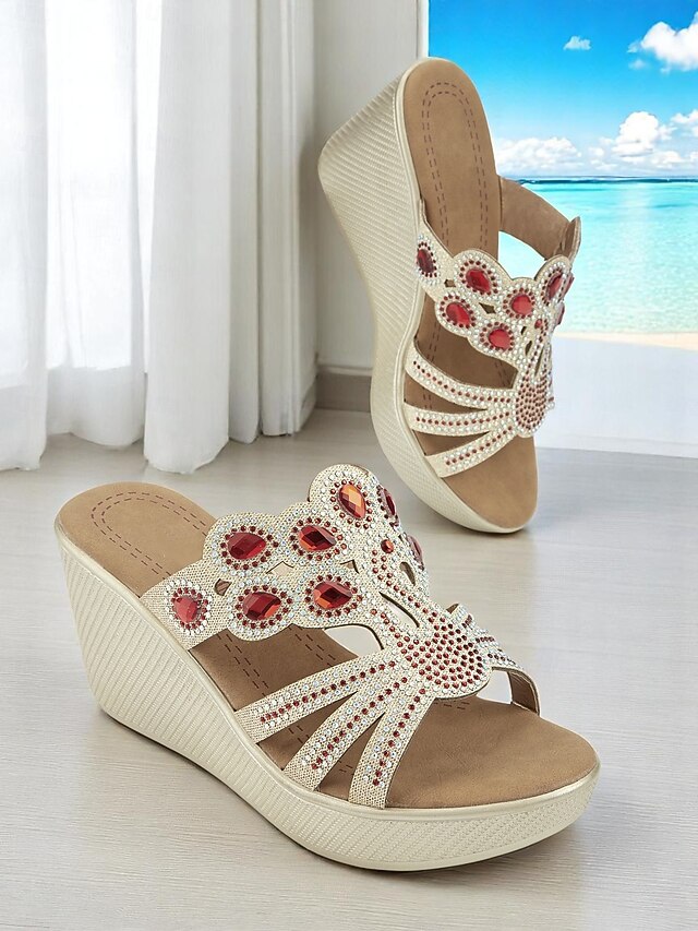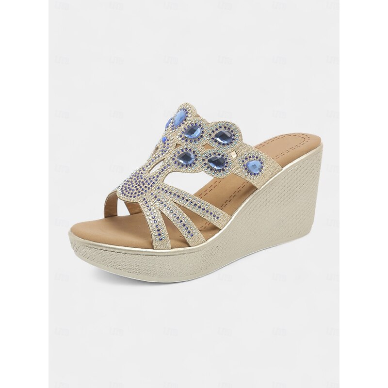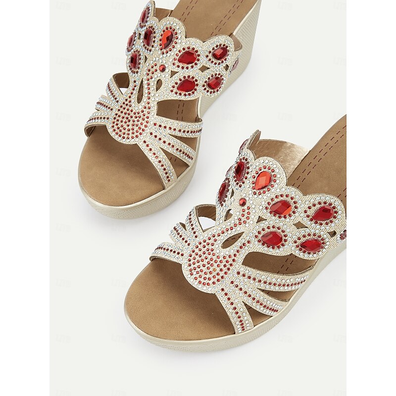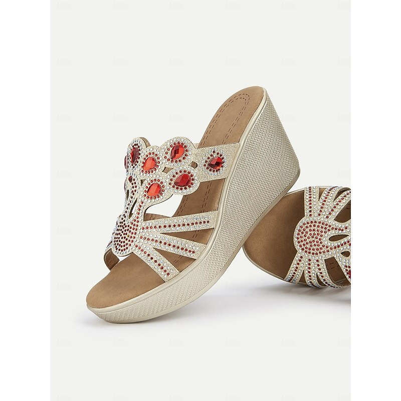 popular ! Women's Boho Gold Rhinestone Wedge Sandals – Sparkly Slip-On Platform Heels for Beach Vacations, Summer Parties, and Resort Wear
