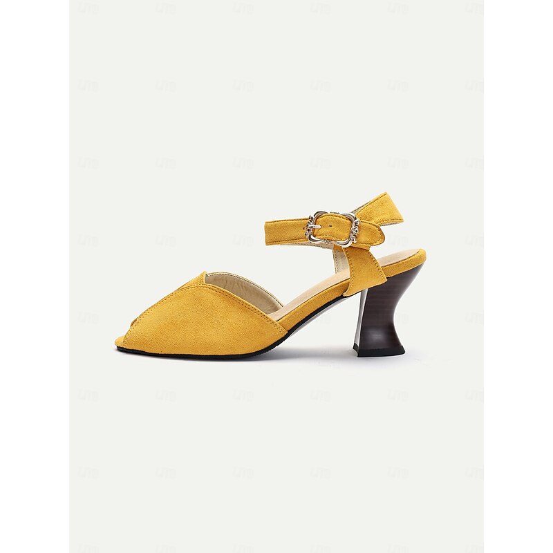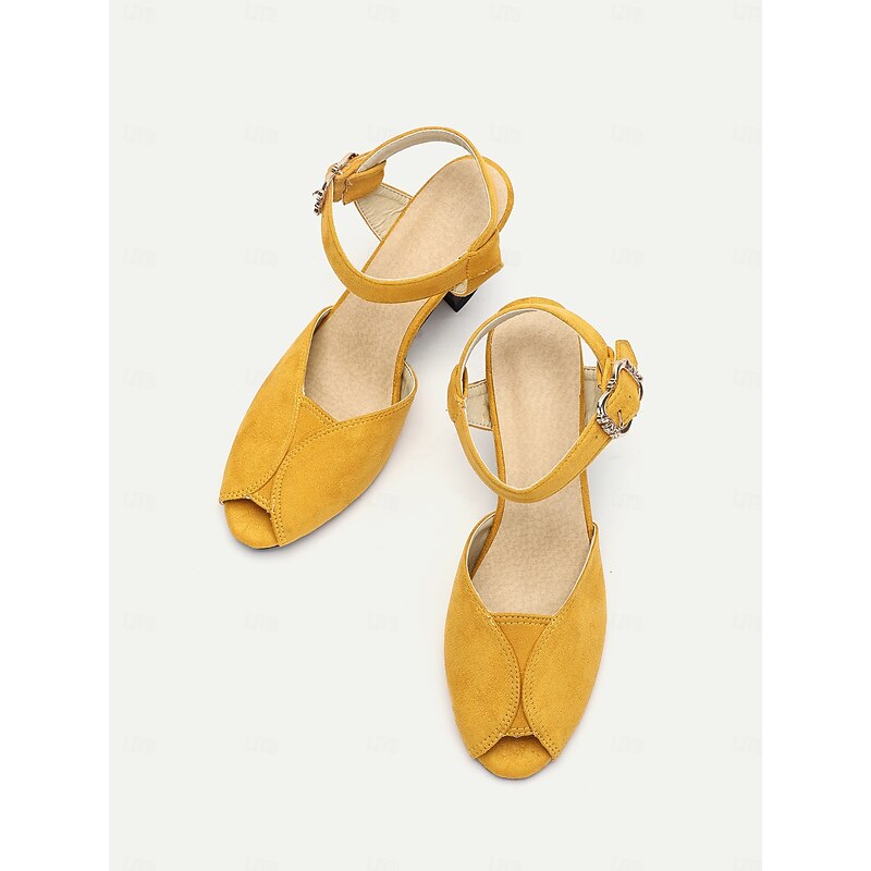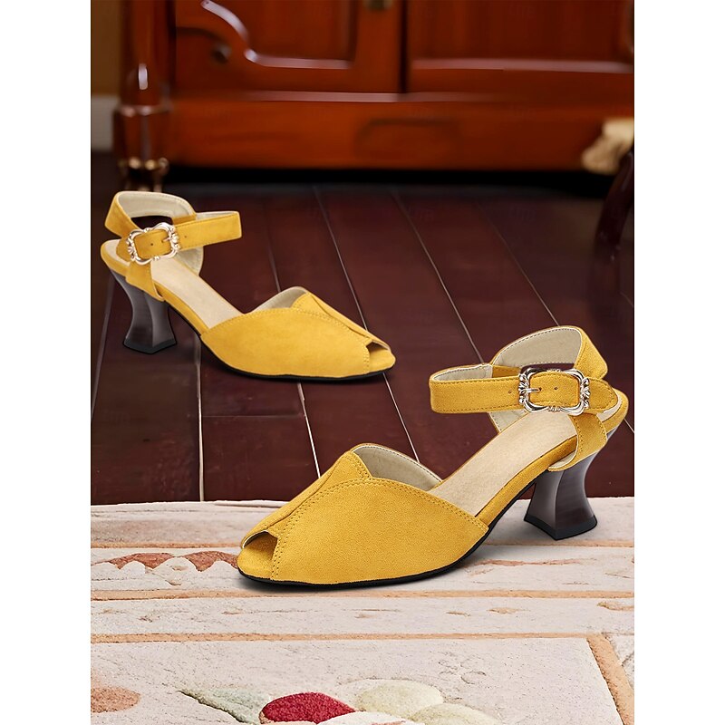 1930s Style Women's Yellow Peep Toe Buckle Sandals – Vintage Mid Heel Dance Shoes for Evening Party & Formal Events 9