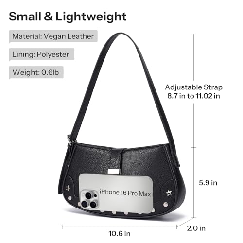 Fabric type: Vegan LeatherOrigin: ImportedClosure type: ZipperLining: Polyester【Retro Y2K Punk Style】 Decorated with eye-catching silver rivets detailing and neat stitching, this vintage purse embraces the trendy Y2K vibe, making it easy to match all your y2k outfits.【Organized Interior】 10.63(L) * 1.97(W) * 5.91(H). This small shoulder purse has 1 main compartment, 1 zipper pocket and 1 slip pocket inside to well organize your daily essentials.【Adjustable Shoulder Strap】 There are 5 adjustable positions on one side of the strap that allow you to adjust the strap drop from 8.3'' to 11''. This Y2K bag weighs only 0.64 lb for effortless carrying.【Secure Closure】 Made of quality vegan leather, this small purse is plush to touch and durable to use. The snap button and zipper closure offer extra security while keeping your items easily accessible.【Suitable for Many Occasions】 This studded purse is perfect for everyday use, travel, work, parties or date night out. It is also an excellent Christmas or birthday gift for daughter, wife or a fashionable friend. Perfect for everyday use. top-grade materials and excellent craftsmanship ensure long-lasting durability.