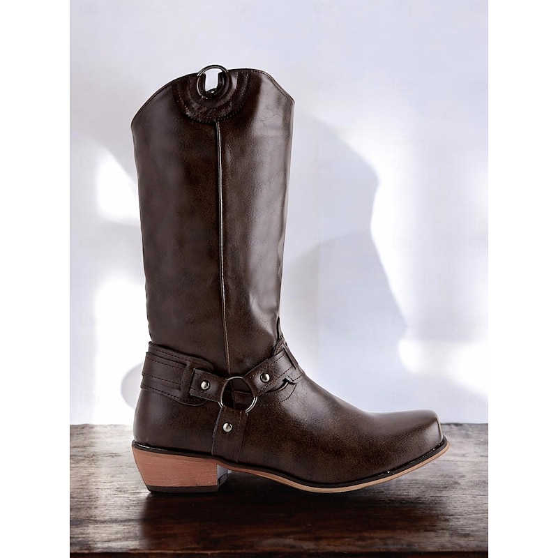 Highlights [Fabric] : Crafted from high-quality PU material, these women's boots are designed for durability and comfort. The smooth brown faux leather provides a chic look that remains versatile for both casual and semi-formal outfits. [Fit] : With a knee-high design, these boots offer a flattering silhouette that's perfect for pairing with a variety of outfits, from skinny jeans to more flowing skirts. The flat heel ensures all-day comfort and support, making them an ideal choice for extended wear. [Design Highlights] : Featuring a decorative silver-tone buckle and ring harness, these boots capture the essence of classic western style with a present-day twist. The round toe design complements the vintage vibe while providing ample room for comfort. A functional zipper closure makes these boots easy to put on and take off. [Occasions] : Perfect for daily wear and outdoor activities, these boots are versatile enough to transition from casual outings to more polished settings. Their classic and timeless design makes them suitable for fall and winter wardrobes, adding a layer of style to any ensemble. [Size Options] : Available in a range of sizes to accommodate different preferences, these boots can be found in US sizes 6 to 10.5, ensuring a fit for most foot sizes. Perfect for everyday use. excellent materials and excellent craftsmanship ensure long-lasting durability.