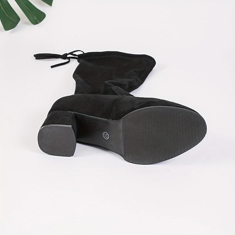 Women's Knee-High Black Faux Suede Boots with Rhinestone Tassel Decor and Chunky Heels – Elegant Fashion Boots for Autumn and Winter 1