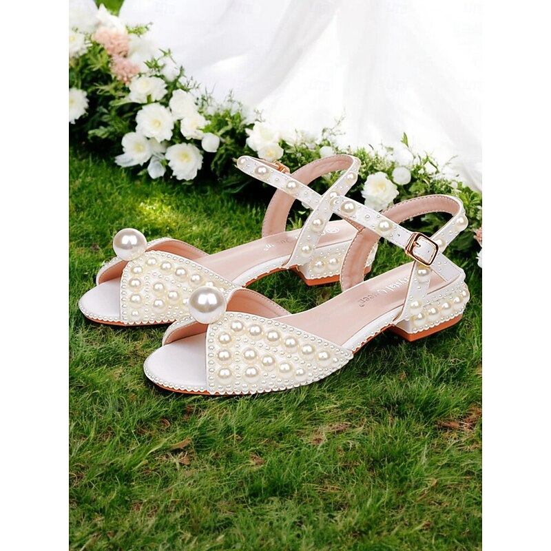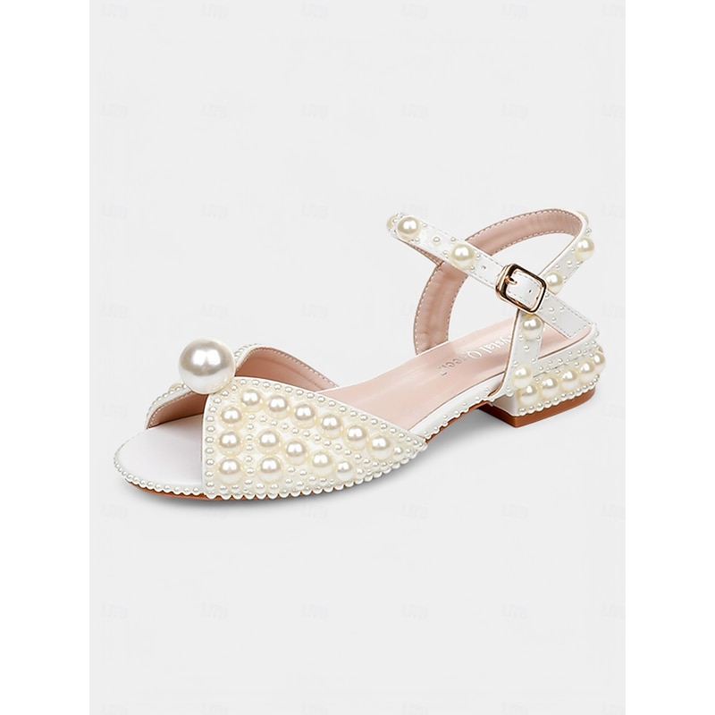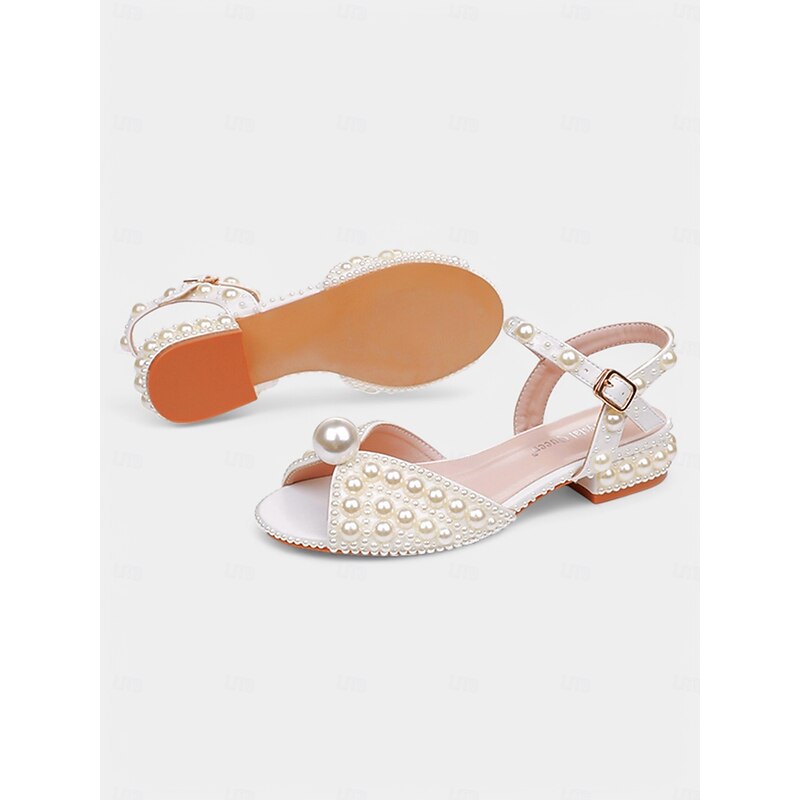 popular ! Women's White Pearl-Embellished Low Heel Sandals – Elegant Open-Toe Wedding & Prom Shoes