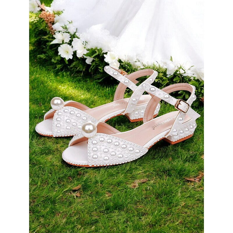 Women's White Pearl-Embellished Low Heel Sandals – Elegant Open-Toe Wedding & Prom Shoes 1