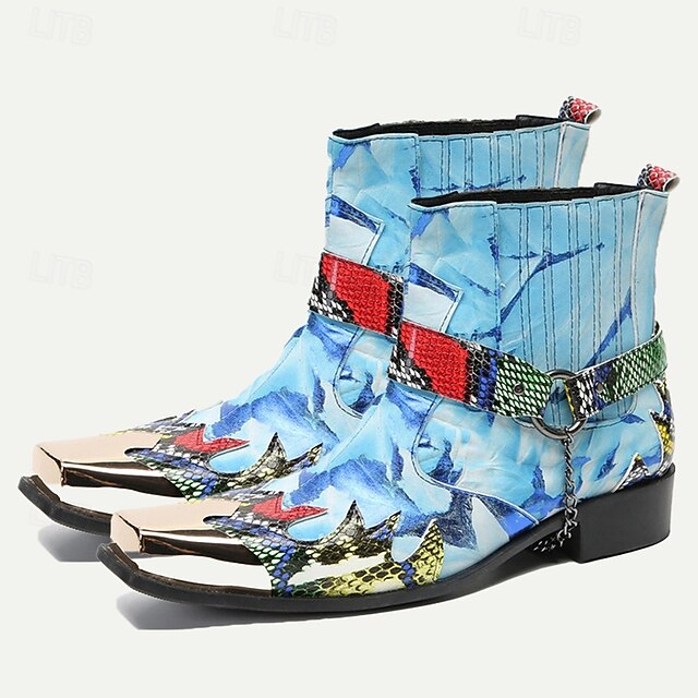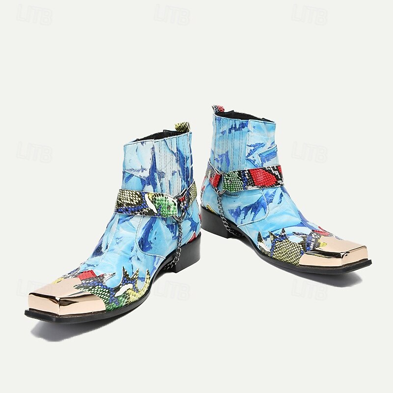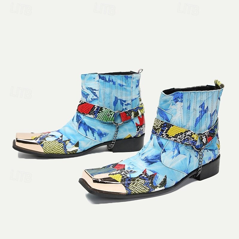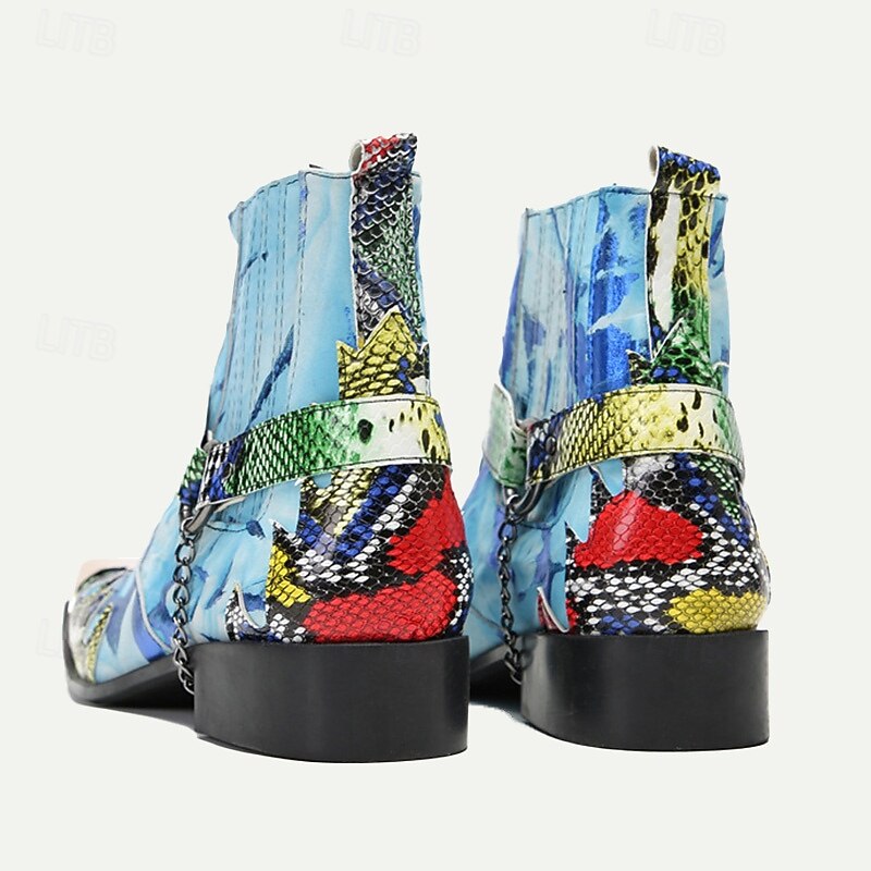 Highlights [Fabric] Crafted from 100% premium Italian full-grain cowhide leather, these men's boots promise superior durability and a luxurious finish. The quality leather lining ensures a comfortable fit, providing both warmth and resilience. [Style and Fit] With an ankle-high silhouette, these boots offer a perfect blend of fashion and practicality. The round-toe design paired with a loafer and buckle closure ensures a snug and secure fit, ideal for those who value comfort without compromising on style. [Design Highlights] These boots stand out with their vibrant, colorful snake print, featuring a striking mix of blue tones enhanced by artistic patterns and bold red, green, and black accents. The distinctive metallic detail at the toe adds a touch of sophistication and edge, making these boots a one-of-a-kind fashion statement. [Occasions] Perfect for a variety of settings, whether you're hitting the road on a motorcycle or attending a casual gathering. These boots add an edgy, western flair to your outfit, making them ideal for both spontaneous adventures and fashionable city strolls. [Size Notice] Available in a wide range of sizes from US5/EU38/UK4 to US13/EU46/UK12, catering to diverse foot sizes and ensuring a perfect fit for every style-conscious individual.