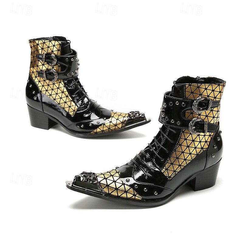 popular ! Men's Black and Gold Geometric Western Boots with Studded Detailing – Bold Fashion Footwear for Parties, Nightlife and Fashion Events