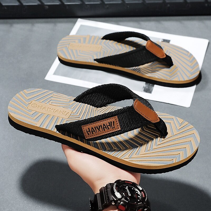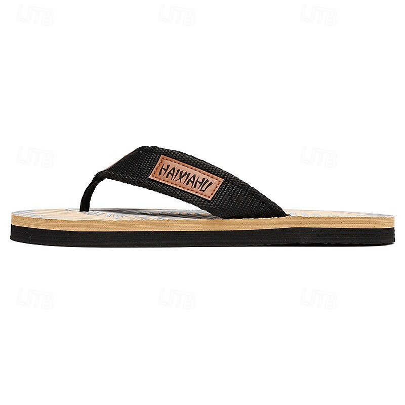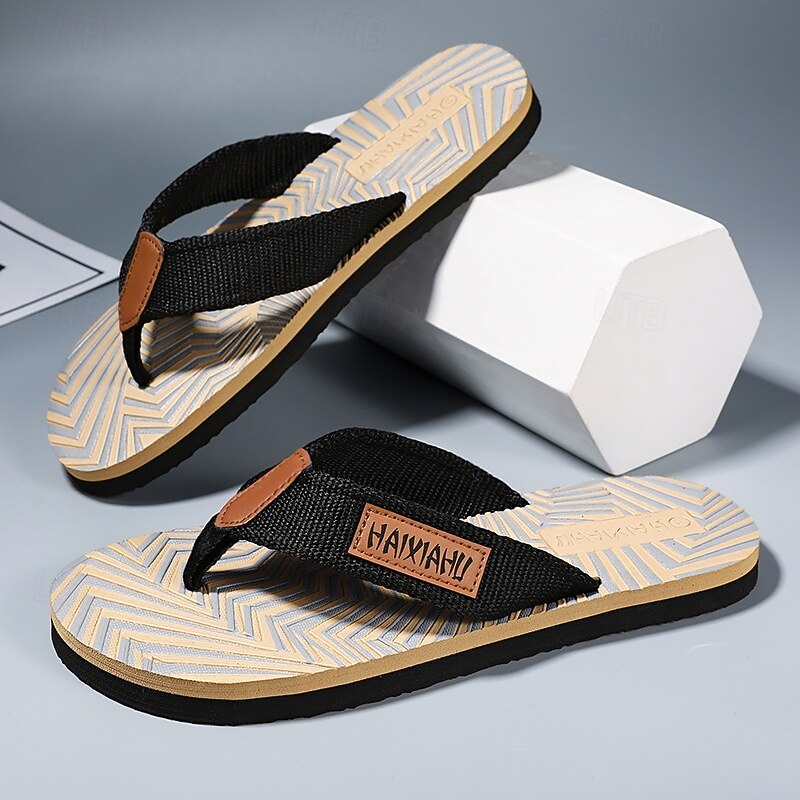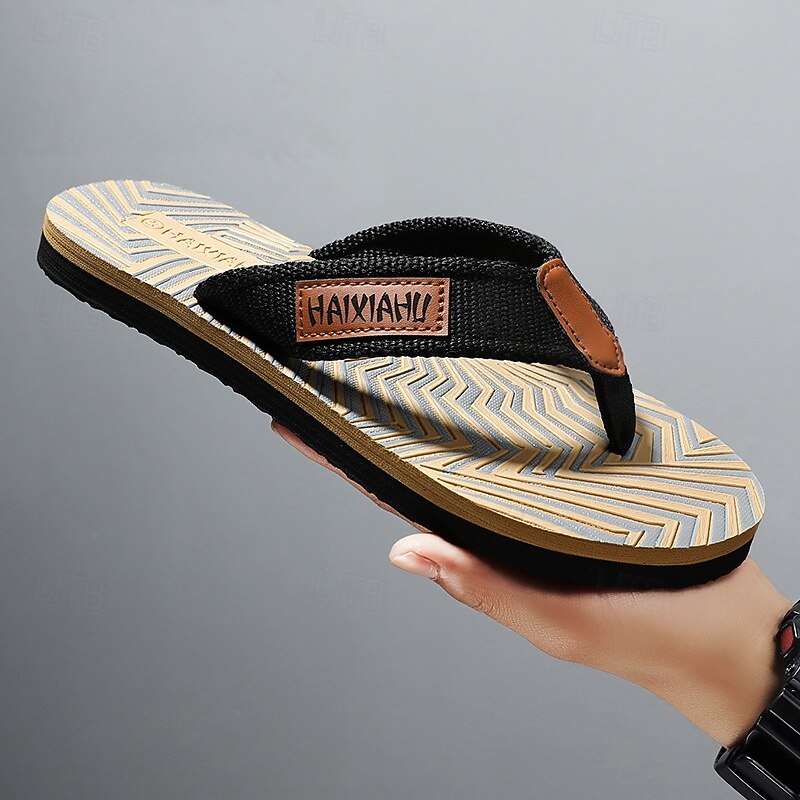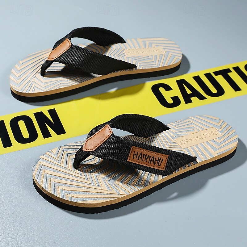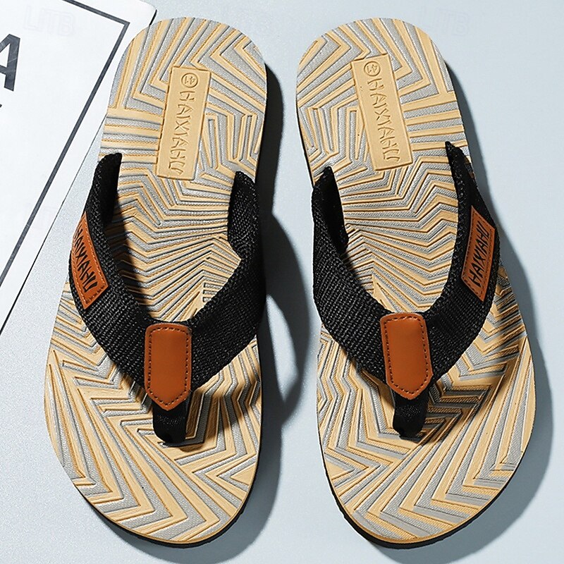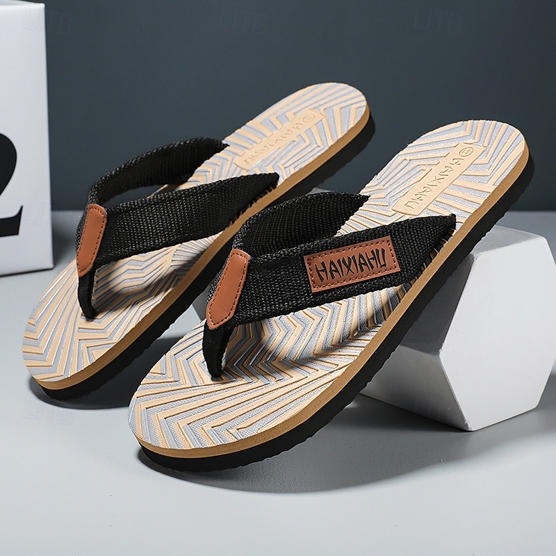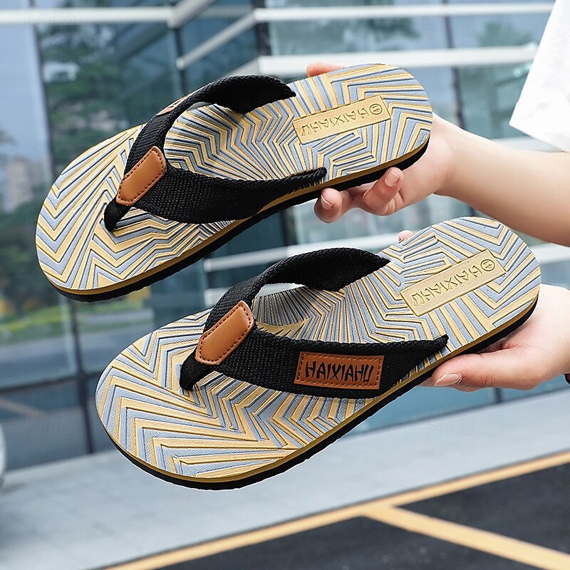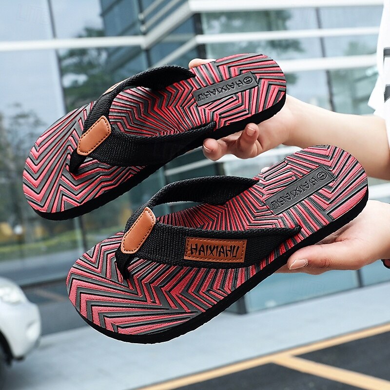 Men's Fashion Flip-Flops - Red and Black Geometric Pattern with Leather Accents - Casual Beachwear 17