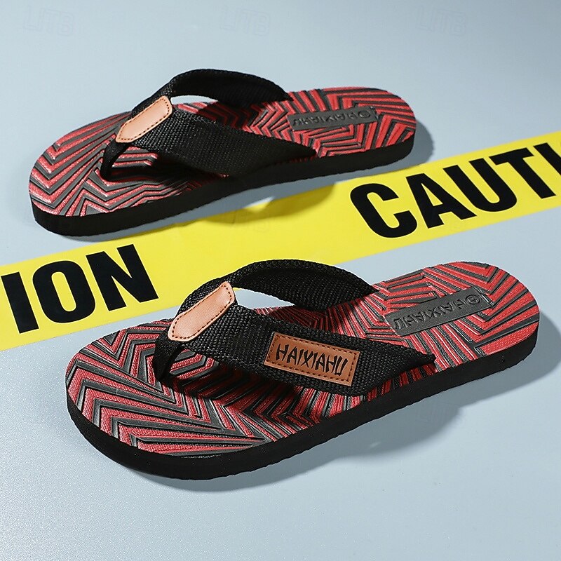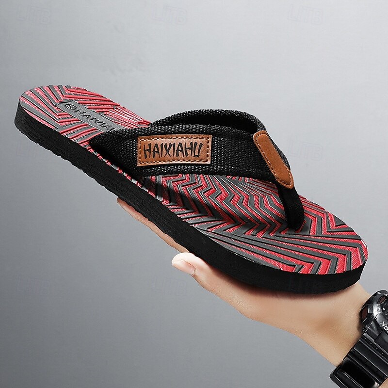 Men's Fashion Flip-Flops - Red and Black Geometric Pattern with Leather Accents - Casual Beachwear 1
