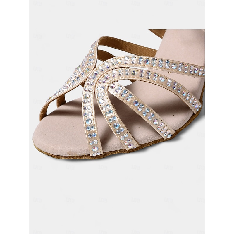 : Adorned with shimmering rhinestones, these sandals boast a glamorous, strappy design and an adjustable lace-up ankle strap for a secure fit. The sparkling embellishments add a sophisticated, fashionable flair to any dance outfit.
