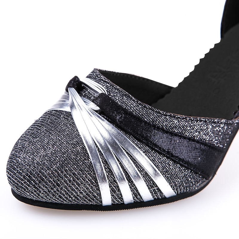 Highlights [Fabric] Crafted from a sparkling glitter fabric, these women's ballroom dance shoes offer a dazzling look that combines elegance with functionality. The upper features a striking glitter splicing design in a classic black color that ensures you will shine on the dance floor. [Fit] Designed with a Cuban heel, these shoes offer a balanced touch of height and comfort. Their closed-toe design provides protection during performances, while the adjustable ankle strap with a buckle ensures a secure fit, making these shoes ideal for both practice and performance. [Design Highlights] The standout feature of these dance shoes is the shimmering glitter upper material, complemented by elegant splicing. The combination of black and silver accents adds a sophisticated flair, ensuring you make a statement with every step. [Occasions] Perfect for ballroom and Latin dance enthusiasts, these shoes are suitable for a variety of settings including performance and practice sessions. Their modern design makes them an excellent choice for waltz and other dance styles, adding glamour to any dance event. [Size Notice] Available in a range of sizes from 33 to 43, these shoes are designed to fit comfortably according to standard sizing conventions. Select your usual size for the best fit, ensuring a perfect match for adult dancers seeking a blend of comfort and style. Perfect for everyday use. excellent materials and excellent craftsmanship ensure long-lasting durability.