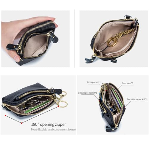 Women Genuine Real Leather Coin Purse with Hand Strap. 3 Zipper Small Wallet Wristlet with 3 credit cards slots Holder - Black 5