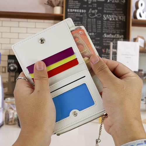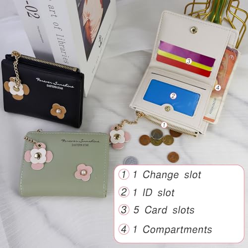 Small Purses for Women, PU Compact Bi-fold Wallet with Zipper Coin Pocket Exquisite Ladies Purse with Floral Buckle Design(White) 1
