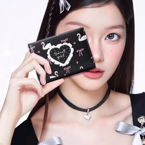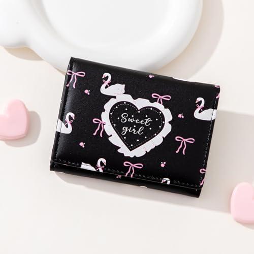 popular ! Small Cutest Wallet with Swan Coquette Bow Print ID Credit Card Holder for Women Girls (BLACK)