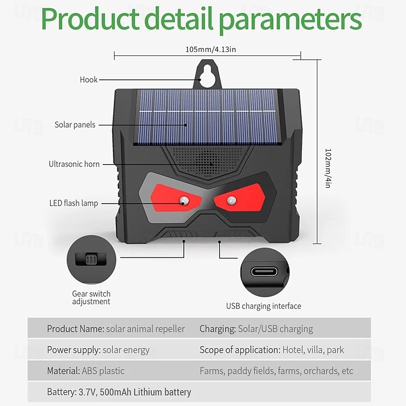 More information about Ultrasonic Animal Repellent Solar Outdoor Waterproof Ultrasonic Bird Repellent Explosive Flash Mouse Repellent USB Solar Charging Method Used for Home Garden Yard Garage Farm 1PC