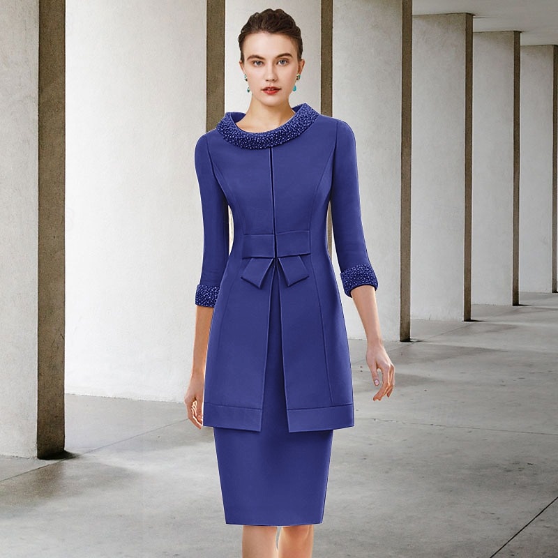 Highlights [Fabric] : This elegant two-piece dress is crafted from luxurious satin, offering a smooth and refined texture with a subtle sheen that exudes sophistication. The high-quality fabric ensures a sleek and polished appearance, suitable for formal occasions. [Silhouette] : The dress features a sheath/column silhouette that enhances a clean and tailored fit. Falling to knee length, it provides a enduring yet modest style, ideal for those seeking a timeless look. The structured cut creates a flattering outline that complements various body types. [Design Highlights] : Adorned with ornate beading around the jewel neckline, this dress adds an exquisite touch of elegance. The decorative embellishments extend to the cap sleeves, offering a cohesive and sophisticated detail. A subtle bow at the waist defines the waistline gracefully, while the included jacket enhances versatility and adds an extra layer of chic sophistication. [Occasions] : Perfect for wedding parties, church events, or as a wedding guest outfit, this dress combines classic charm with new-age elegance. Its timeless style makes it suitable for a variety of formal occasions, ensuring you stand out gracefully. [Size Range] : Available in a broad range of sizes from US 0 to US 26W, with custom measurements options ensuring a perfect fit for every individual. This comprehensive size range accommodates diverse preferences and body types, making it accessible to a wide audience.
