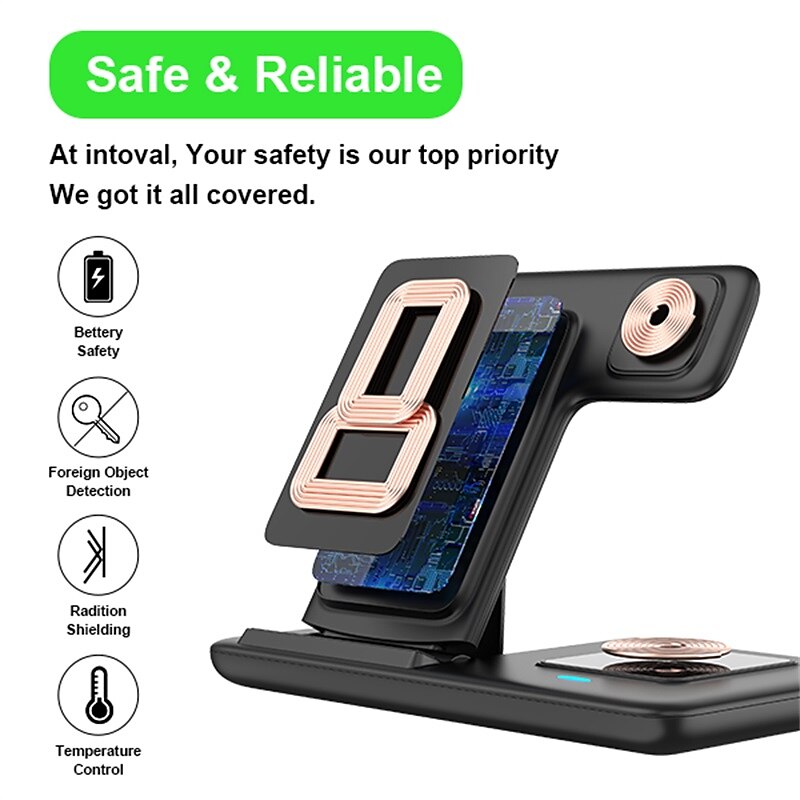 Highlights - Upgraded 3 in 1 Wireless Charger: This charging station supports fast charging for multiple devices simultaneously. It is compatible with various iPhone models and Apple Watch, making it a must-have device for Apple fans. - Safety Fast Charging: Our charging station utilizes high-power charging chips and top-quality electronic components to ensure fast and safe wireless charging. With the equipped 18W adapter, it can fully charge your devices in just 2-3 hours, 30% faster than other iPhone wireless chargers. - Foldable & Portable Design: The charger is foldable and can easily fit in your bag or suitcase. Whether you are at home, in the office, or on the go, you can conveniently charge multiple devices at once. Additionally, it doubles as a cellphone stand with adjustable angles. - Safe Charging Dock: Designed with dual-coils, our charger offers a wider charging area in landscape or portrait orientation. It also features over-current, over-voltage, and over-temperature protection, as well as a foreign object detection function, ensuring safe charging for your devices. - Smart Breathing Nightlight: The sleek design of our charger includes a green light indicator for proper charging and a flashing blue light to alert you of any foreign objects or misplaced phones. It also doubles as a desk lamp with wireless charging functionality. - Anti-Slip and Case Friendly: Silicone pads prevent your devices from sliding off the charger, and it is compatible with phone protective cases up to 2.5mm in thickness. No need to remove your phone case while charging. Simplify your life space with this convenient cellphone accessory. faultless for everyday use. top-grade materials and excellent craftsmanship ensure long-lasting durability.