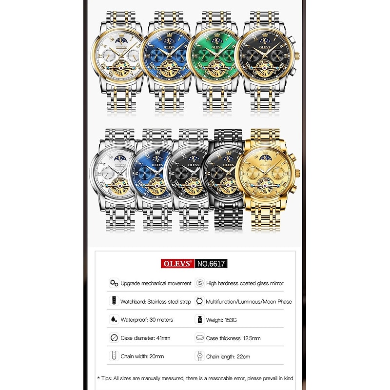 OLEVS Men Mechanical Watch Calendar Luxury Waterproof Fashion Automatic Self-winding Moon phase Luminous Stainless Steel Strap Watch 22