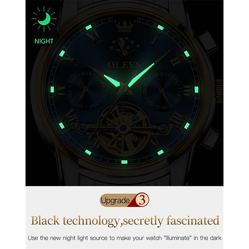OLEVS Men Mechanical Watch Calendar Luxury Waterproof Fashion Automatic Self-winding Moon phase Luminous Stainless Steel Strap Watch 4