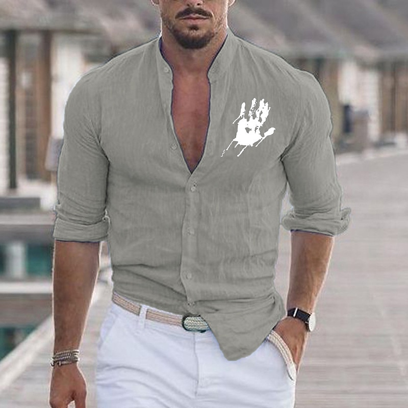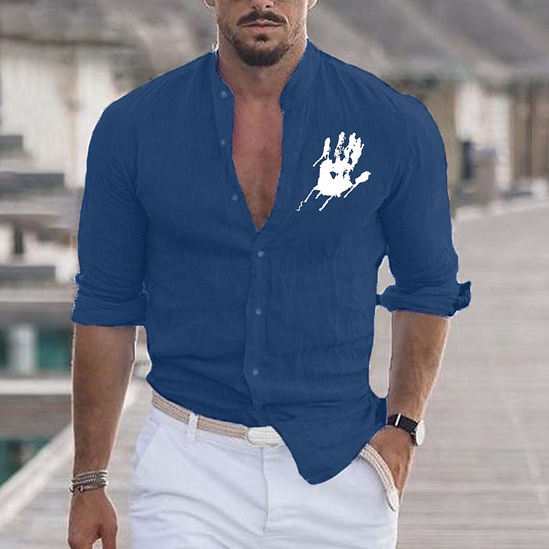 Highlights [Fabric:] Crafted from a blend of cotton and polyester, this men's shirt combines comfort with durability, ensuring breathability and ease of movement for everyday wear during the Spring and Fall seasons. [Fit:] Designed with a regular fit, this shirt provides a comfortable yet chic silhouette that enhances the wearer's physique without compromising on a laid-back look. [Design Highlights:] The shirt features a modern stand collar and a striking print design, including a unique handprint and emoji face pattern that adds an edgy and artistic flair. The classic button-down front allows for easy wear, while the long sleeves can be rolled up for a relaxed, fashionable appearance. [Occasions:] Ideal for a variety of occasions, including daily wear, outdoor activities, vacations, and casual gatherings. Whether you're heading out for a day in the city or a relaxed weekend getaway, this versatile shirt perfectly balances style and comfort. [Size Range:] Available in a broad size range from S to 3XL, accommodating a diverse selection of body types to ensure the perfect fit for every wearer. Choose from five versatile colors: Blue, White, Black, Red, and Gray, to match your personal style. Perfect for everyday use. supreme materials and excellent craftsmanship ensure long-lasting durability.