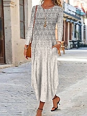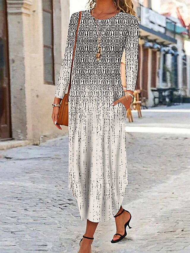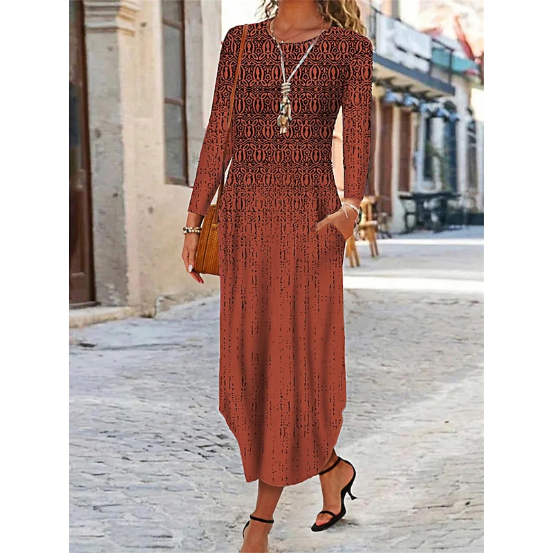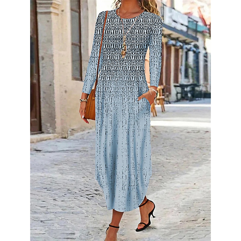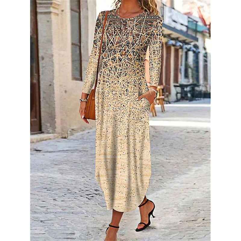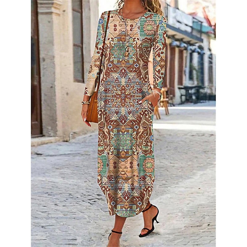 Highlights ```html [Fabric]: The dress is crafted from high-quality polyester, offering a soft and lightweight feel, with a touch of micro-elasticity for added comfort. The inclusion of Cotton Spandex Jersey ensures it maintains its structure while allowing for ease of movement. [Fit]: Featuring a regular fit with a flowing maxi length, this dress provides a relaxed silhouette that is both flattering and comfortable. Designed for versatility, it transitions seamlessly between casual daytime outings and semi-formal evening events. [Design Highlights]: This vintage-inspired dress is adorned with a captivating floral and tribal print that adds a touch of ethnic charm. The crew neck and long sleeves provide a sophisticated look, while practical pockets and a sophisticated split enhance its functional and fashionable appeal. [Occasions]: Perfect for vacations, daily wear, outdoor adventures, and weekend gatherings, this dress suits a variety of settings from relaxed weekend wear to elegant dinners. Pair it with a statement necklace and a chic handbag for an effortlessly stylish appearance. [Size Range]: Available in a range of sizes from S to XXL, this dress caters to a variety of body types, ensuring a comfortable fit for everyone. ``` Perfect for everyday use. top-grade materials and excellent craftsmanship ensure long-lasting durability.