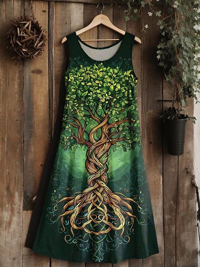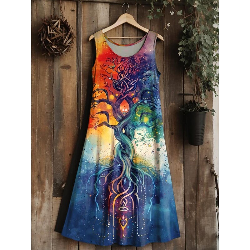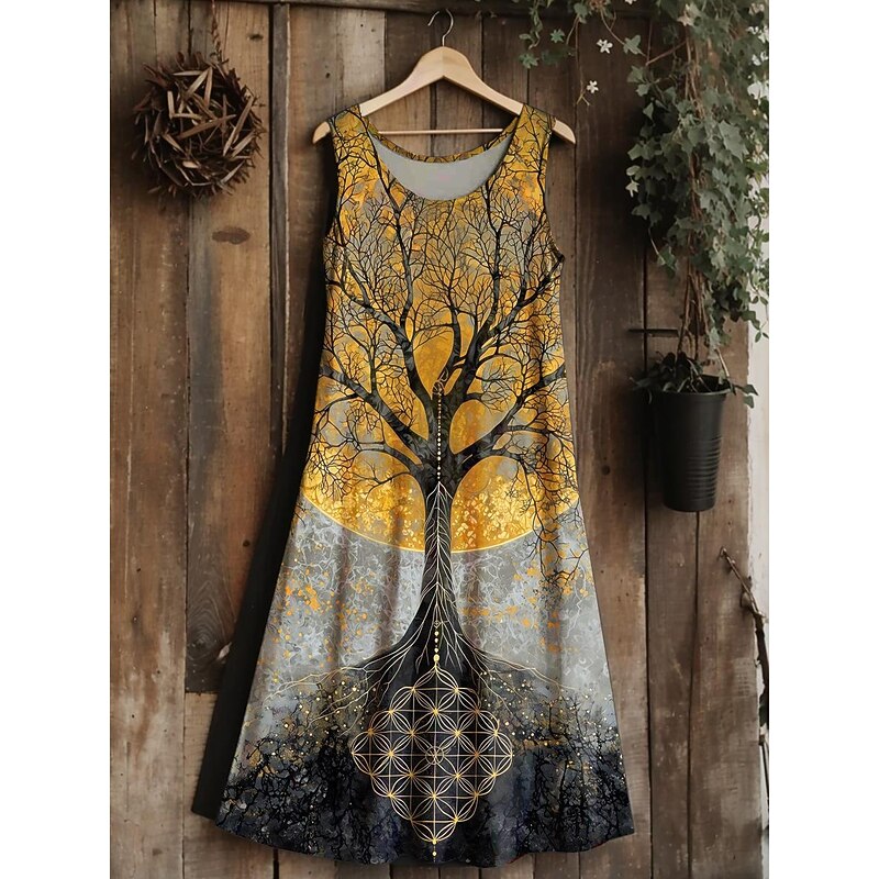 popular ! Women's tree of life Merkabah Midi Dress Sundress A Line Dress Vacation Casual Boho Wedding Party Going out Standard Fit Floral Graphic Leaf Sleeveless U Neck Silver
