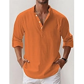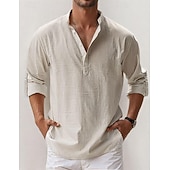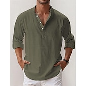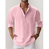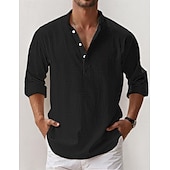 popular ! Men's Linen Shirt Popover Shirt Summer Shirt Beach Wear Casual Shirt Band Collar Shirt Plain Vacation Hawaiian Black White Pink Blue Long Sleeve Henley Spring & Summer Clothing Apparel