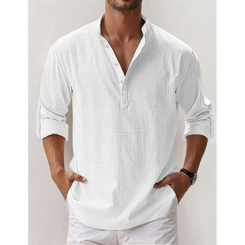 Men's Linen Shirt Popover Shirt Summer Shirt Beach Wear Casual Shirt Band Collar Shirt Plain Vacation Hawaiian Black White Pink Blue Long Sleeve Henley Spring & Summer Clothing Apparel 1