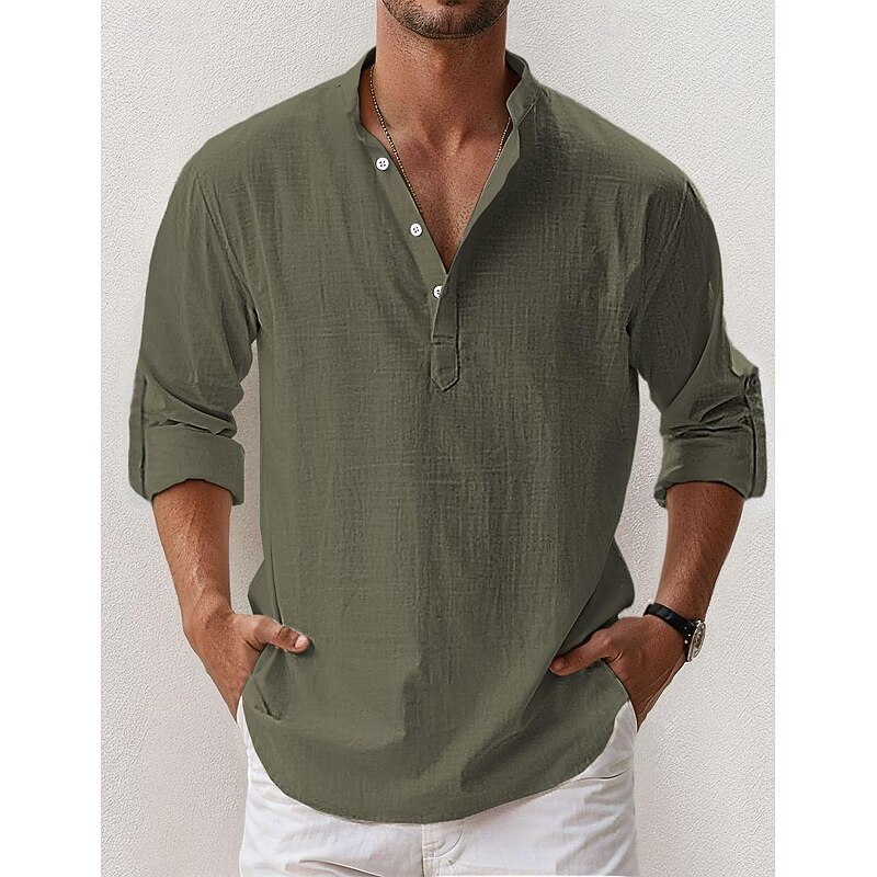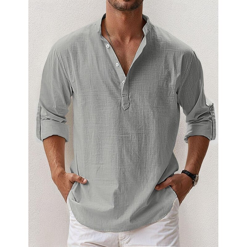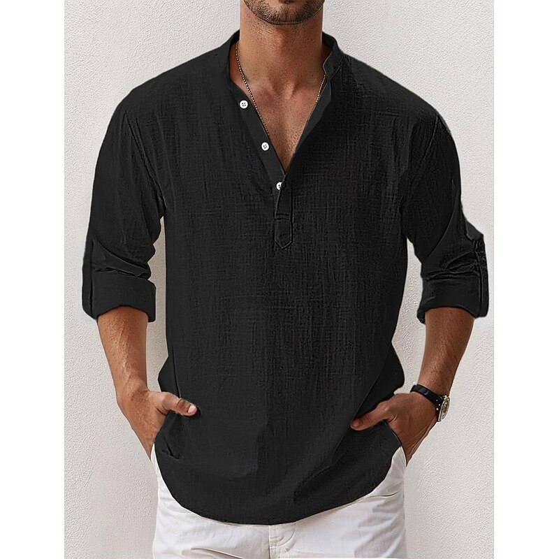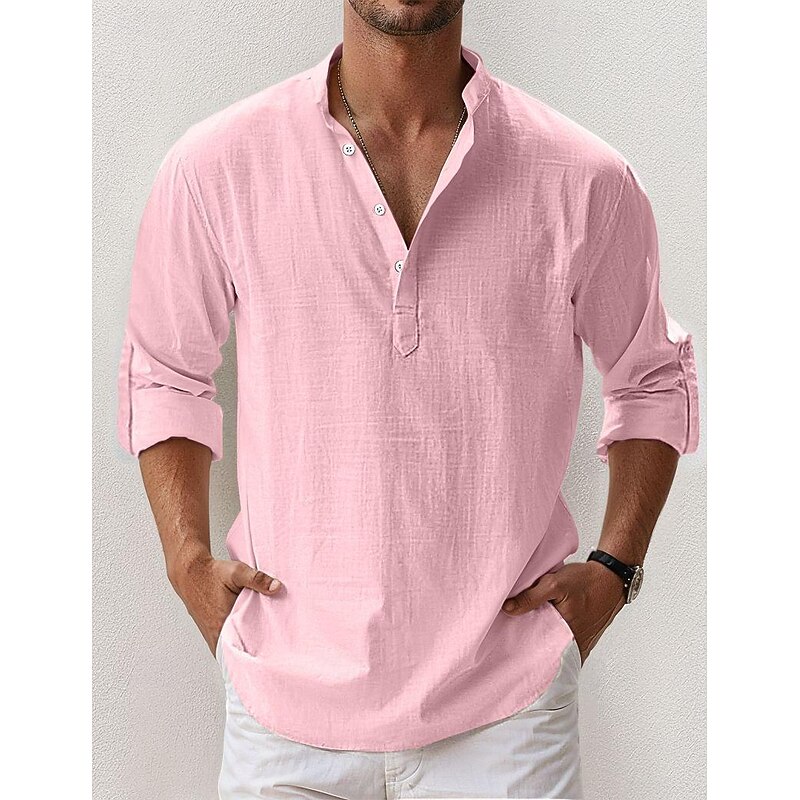 Men's Linen Shirt Popover Shirt Summer Shirt Beach Wear Casual Shirt Band Collar Shirt Plain Vacation Hawaiian Black White Pink Blue Long Sleeve Henley Spring & Summer Clothing Apparel 11