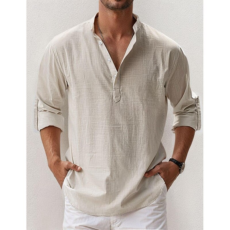 Men's Linen Shirt Popover Shirt Summer Shirt Beach Wear Casual Shirt Band Collar Shirt Plain Vacation Hawaiian Black White Pink Blue Long Sleeve Henley Spring & Summer Clothing Apparel 7