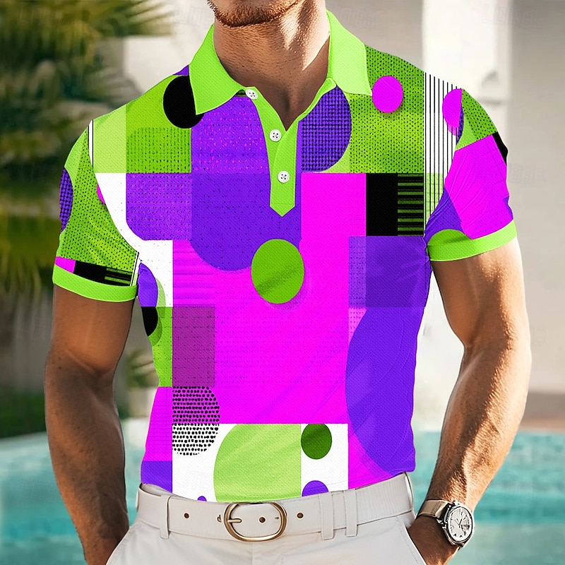 popular ! Men's Polo Vacation Street Turndown Short Sleeve Vacation Geometric Color Block Buttons Summer Slim Fit Lake blue Blue Yellow Green Polo
