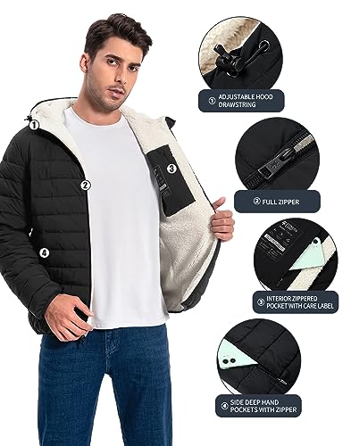 Fabric type: Shell/Lining/Filler: Full PolyesterCare instructions: Machine WashOrigin: ImportedWATER RESISTANT & WINDPROOF: With water-repellent shell fabric, men sherpa jacket with hood can keep you warm and dry from bad rainy or misty weather, featuring quilted stitching to add style, functionality and retention of heat.SHERPA LINING: Filled with down alternative insulation, men's puffer jacket better locks in heat. Interior plush, thick and plush sherpa provides extra warmth.KEEP WARM: Sherpa lined hood with adjustable drawstring, elastic cuffs and hem can retain heat to keep you warm from strong wind in cold time. Puffy jacket for men is easier to put on/off with top-grade zipper, avoiding stuck issues.3 ZIPPER POCKETS: With 2 Deep zippered hand pockets at side seam, 1 zippered pocket inside(enough for 6.7 phone), mens quilted jackets better warm your hands and store your belongings, avoiding loss during walking or other activities.OCCASION: This winter jacket for men is easy portable for travelling, avoid adding more weight to your vacation. Also suitable for camping, hiking, casual, school, work, fall & winter wearing. Best gifts for you and male friends, father's day gifts, birthday present, Christmas gift for him, etc. Perfect for everyday use. High quality materials and excellent craftsmanship ensure long-lasting durability.