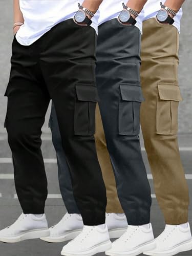 SOLY HUX Men's Cargo Pants Elastic Waist Slim Fit Outdoor Hiking Joggers with Pockets 3 Packs