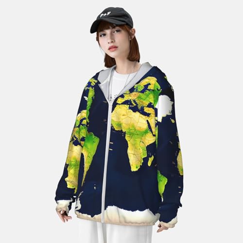 Fabric type: 100% PolyesterNeck style: V-NeckSleeve type: Long SleeveFit type: Regular FitLightweight Fabric: The adult lightweight sports long sleeved sunscreen shirt is made of lightweight fabric, which feels like a second layer of skin. This shirt is made of lightweight fabric, ensuring that you can perform at your best in any sport. Whether you are sprinting on the track, doing yoga stretches, or engaging in high-intensity cross training, this lightweight fabric will not limit your movement in the slightest, allowing your performance to be seamless and unobstructed.Design: This World Map printed shirt features a zipper design for easy on and off. Hooded design, fashionable and versatile. snug design that can be paired with various bottoms. The cuffs and hem design are comfortable, not tight, both comfortable and practical.Sun Protection: This shirt is your reliable shield against harmful sunlight. It can effectively reduce sunburn. Whether you're playing golf on a sunny day, hiking a long distance, or just relaxing by the pool, this shirt provides sun protection, allowing you to enjoy outdoor activities without worrying about being constantly exposed to the sun.Breathability: This shirt features breathable sweat wicking technology that keeps you comfortable even during the most intense training. This fabric allows for free air circulation, prevents overheating, and ensures you stay cool. At the same time, it quickly absorbs sweat from the skin, accelerating the evaporation process. This means that you will stay dry throughout the entire exercise process, avoiding discomfort caused by sweaty, sticky shirts, and maintaining your attention and energyMulti functional: This long sleeved sunscreen shirt has a wide range of uses and is fit for various outdoor sports and activities. It is very fit for water sports such as swimming, surfing, and paddleboarding, as well as land activities such as cycling, running, and rock climbing. The practical design makes it a must-have for all seasons. You can easily pair it with different sports equipment, from shorts for warm weather activities to tight pants or sports pants for cool weather. Perfect for everyday use. first-class materials and excellent craftsmanship ensure long-lasting durability.