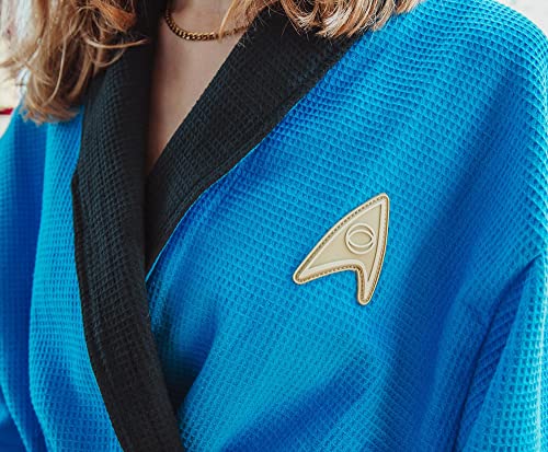 • STARFLEET'S FINEST: The luxury of a hotel spa meets the comfort of space in this bathrobe. Takes inspiration from Starfleet's Sciences and Medical blue division uniform, featuring the embroidered rank braiding at the sleeves and a rubber badge.